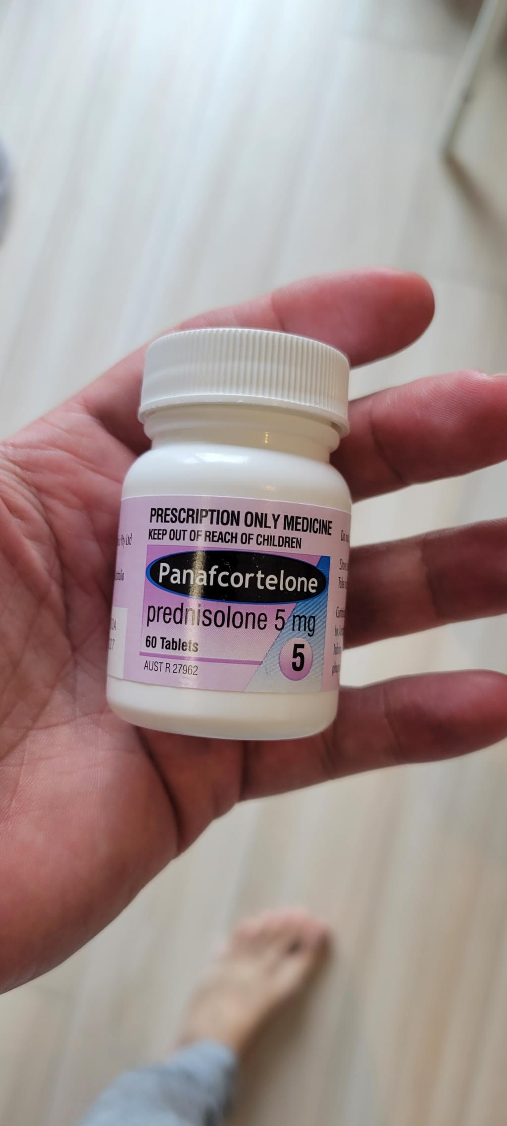 Panafcorteloneの有効成分は合成副腎皮質ホルモン=プレドニゾロン5mgである。国内承認薬としてプレドニンの薬名で普及し、数種類のジェネリック薬もある。一日服用量が15mg以下なら、重篤な副作用はないとされるがステロイド薬であるが故、医師は処方に慎重で服用量、日数を制限する。炎症、アレルギー症状、リンパ系代謝不全等には他の薬剤で効果がでないとき、顕著な改善効果がえられる。この薬効は患者にとってリスクはあるが得難いものである。