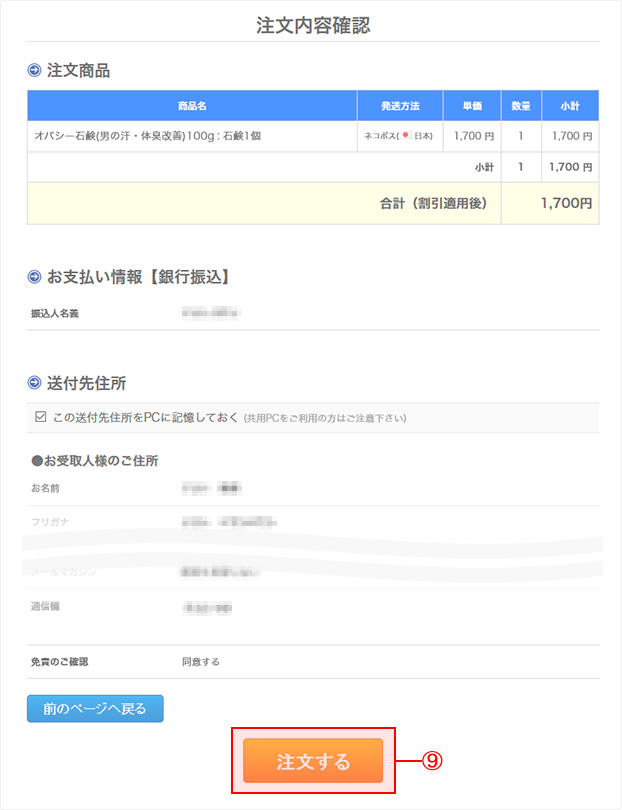 ⑨最終注文確認画面で注文商品、お支払い情報、送付先住所に誤りがないか確認し、「注文する」ボタンをクリックします。