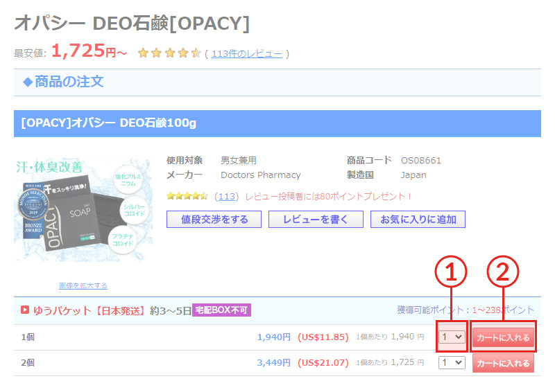 ②「カートに入れる」ボタンを押し、商品をカートに入れます。