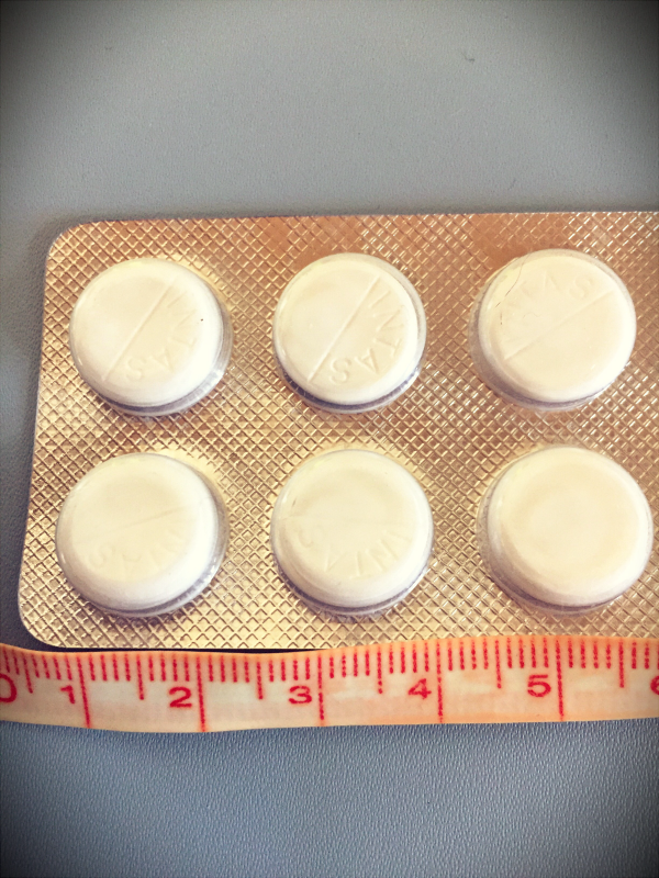 錠剤は丸いかたちで、真ん中に溝が入っていて半錠にできるのがいいです。