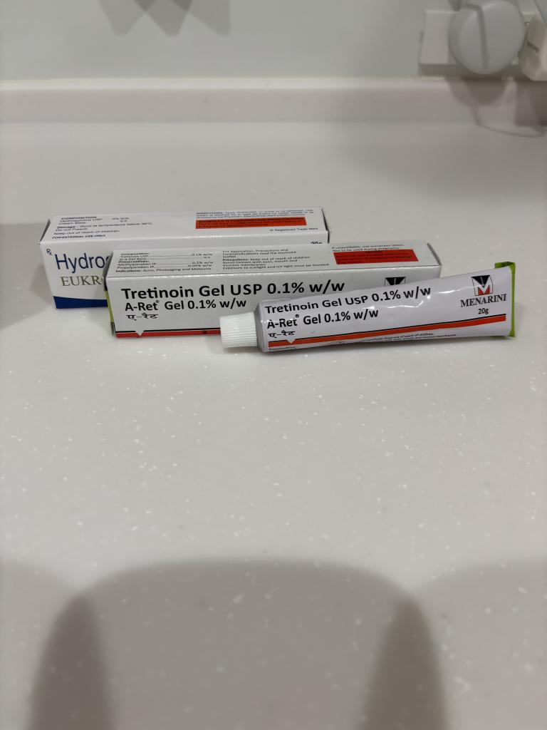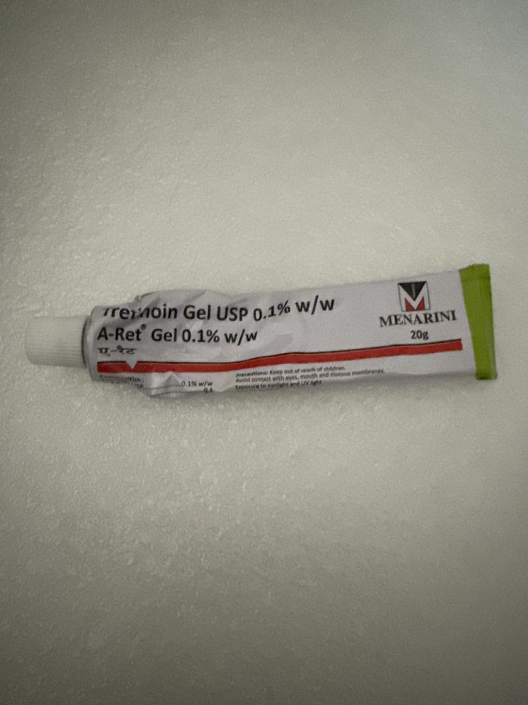 始めはトレチノインクリーム0.025%を数日間使用して剥けがなく0.05%へ上げましたが反応もほとんどなく、在庫が潤沢なトレチノインジェル1%を買いました。