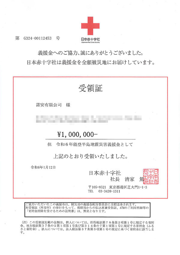 弊社では、今回の地震における災害義援金として、1,000,000円を日本赤十字社へ寄付いたしました。 被災された皆さまの一日も早い生活の再建と、被災地の復旧をお祈りいたします。